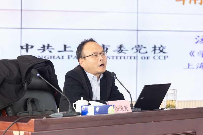 汤荣光教授简要介绍了党的十九届六中全会的基本情况,就党的历史上三个历史决议形成的背景和重要意义做了深入阐述。他重点围绕“三问”,即历史之问、时代之问和成功之问,分析了党的十九届六中全会的宏阔视野;聚焦六中全会核心内容,对“三答”即“四个伟大成就”、“五大历史意义”和“十条历史经验”等重要内容进行了详细解读,指出要用历史映照现实、远观未来,从中国共产党的百年奋斗中看清楚过去我们为什么能够成功、弄明白未来我们怎样才能继续成功,从而在新的征程上更加坚定、更加自觉地牢记初心使命、开创美好未来。他强调,贯彻落实党的十九届六中全会的精神要义,重点是要做到“四行”,即指导思想“笃行”,决议精神“躬行”,党的建设“力行”,未来征程“前行”,我们要牢记中国共产党是什么、要干什么这个根本问题,继续推进新时代党的建设新的伟大工程,以优异成绩迎接党的二十大召开。