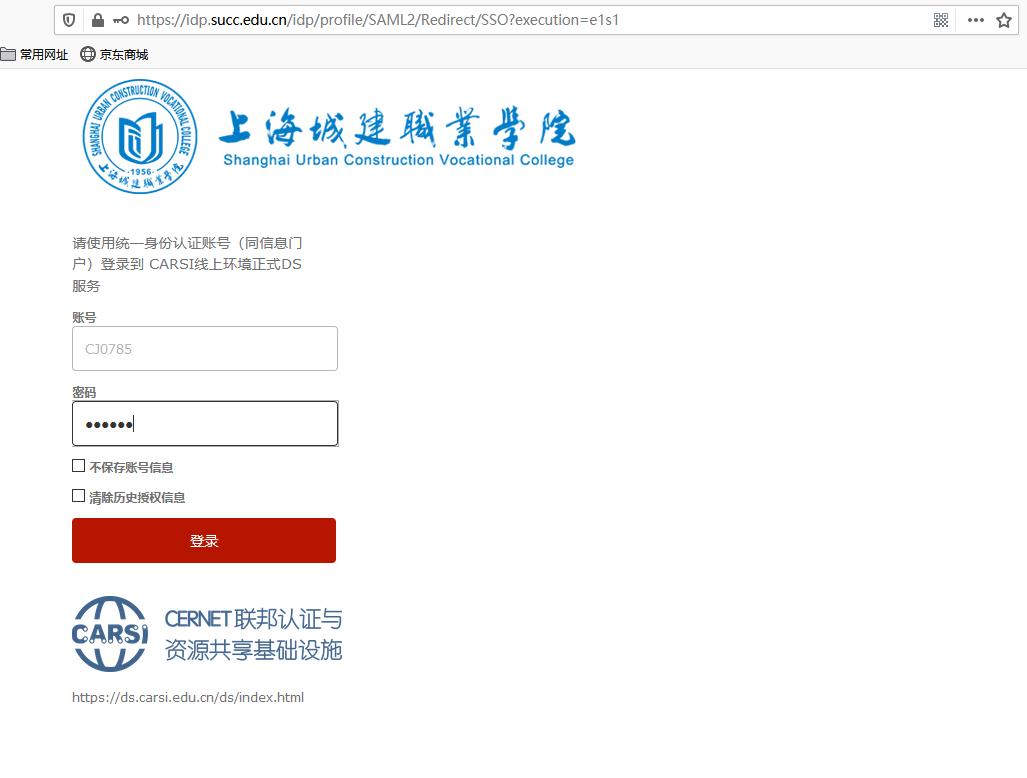 1、在浏览器输入访问入口网址ds.carsi.edu.cn,在页面的“请输入高校/机构名称”检索框中输入“上海城建职业学院”(支持模糊检索),点击“登录”。
