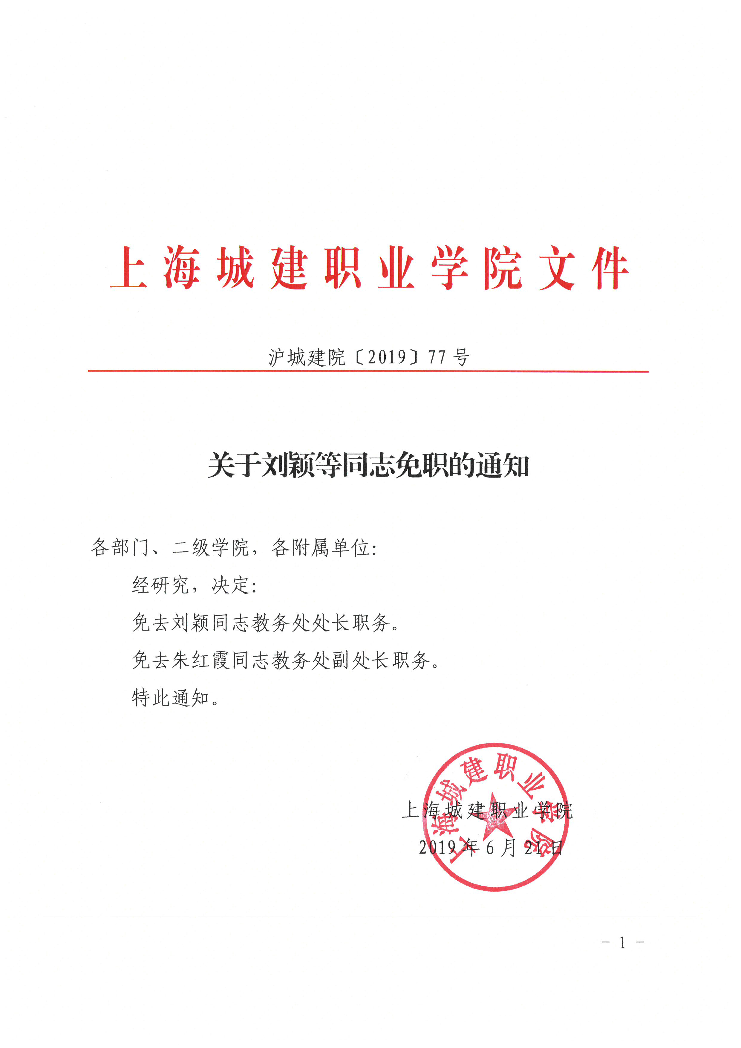 沪城建院〔2019〕77号关于刘颖等同志免职的通知