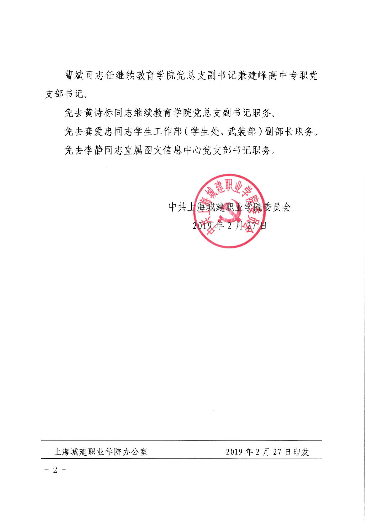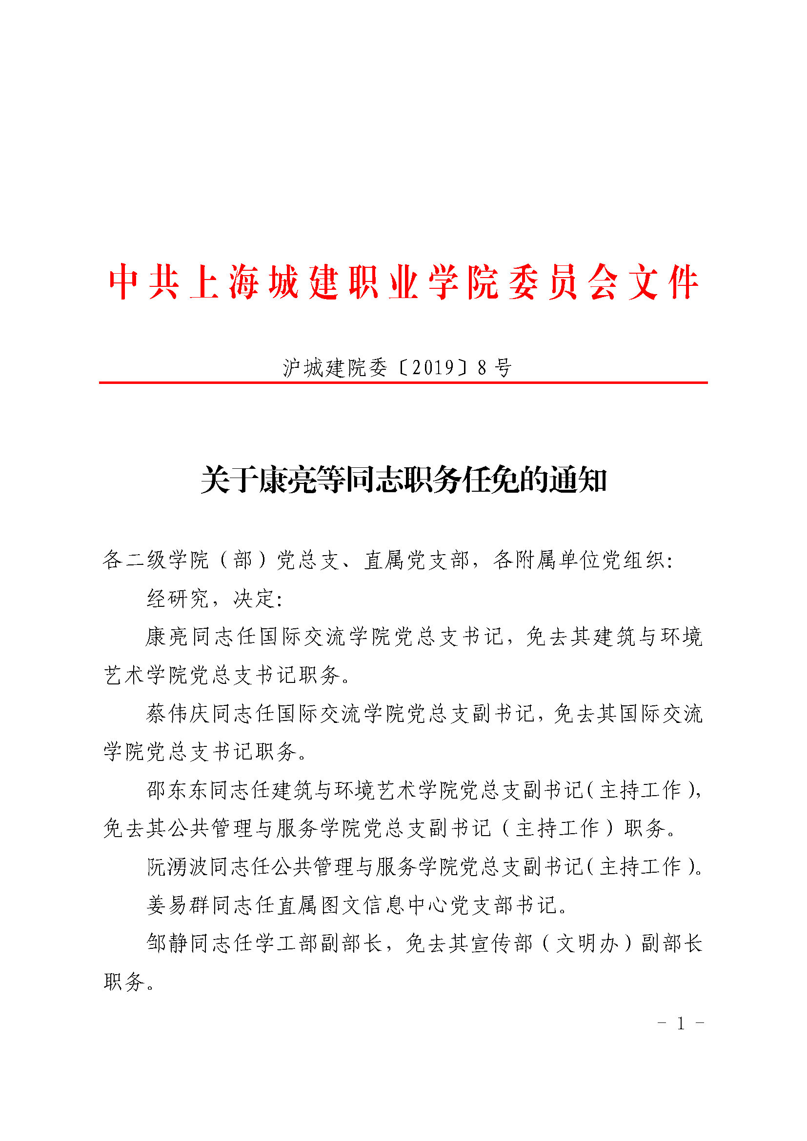 沪城建院委〔2019〕8号关于康亮等同志职务任免的通知