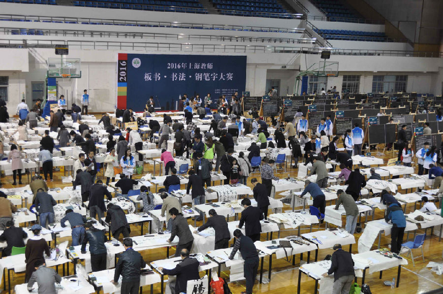 4月23日上午,由中国教育工会上海市委员会主办的2016年上海教师板书、书法、钢笔字大赛在第二工业大学隆重举行。全市各高校、区县和中职校共500多位选手分别参加了各类别中、青年组的角逐。比赛场面恢宏,竞争气氛浓烈,各奖项按一等奖3%、二等奖6%、三等奖10%、优胜奖15%的比例设置,比赛充分展示了“老师一手好字”的艺术风采。